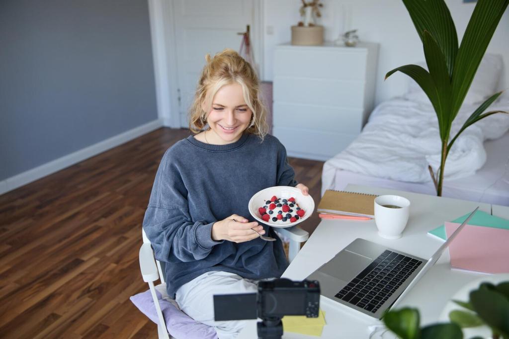 Feiere abgeschlossene Tasks mit Mini-Belohnungen ohne Essen: fünf Minuten Sonne, Lieblingssong, kurze Dehneinheit. So bleibt Snack Genuss statt Trost. Probiere heute drei Alternativen aus und berichte, welche dich am meisten motiviert.